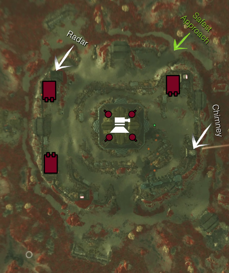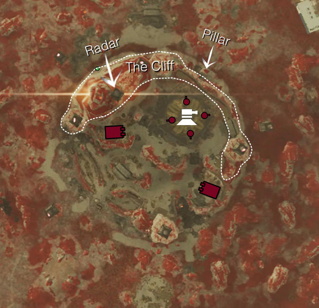 Visually: The bunker is surrounded by a half-moon shaped cliff, on top of which stands an Automaton radar.
